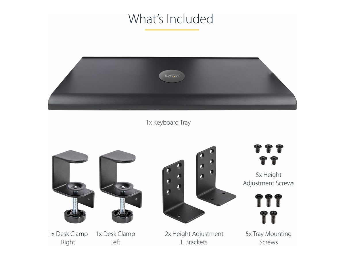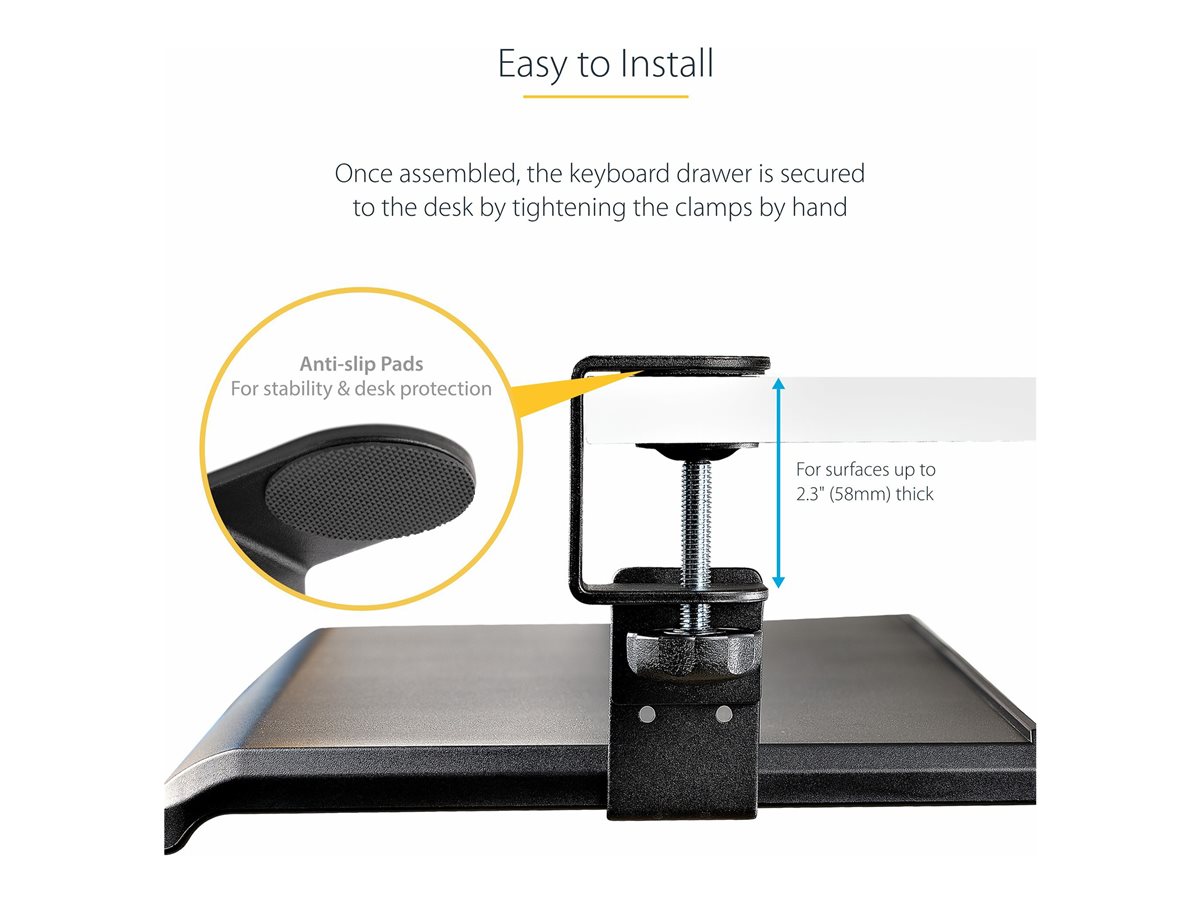 | Popis výrobku | StarTech.com Under-Desk Keyboard Tray, Clamp-on Keyboard Holder, Supports up to 12kg (26.5lb), Sliding Keyboard and Mouse Drawer with C-Clamps, Height Adjustable Keyboard Tray - Black - Ergonomic Keyboard Tray (KEYBOARD-TRAY-CLAMP1) - keyboard tray |