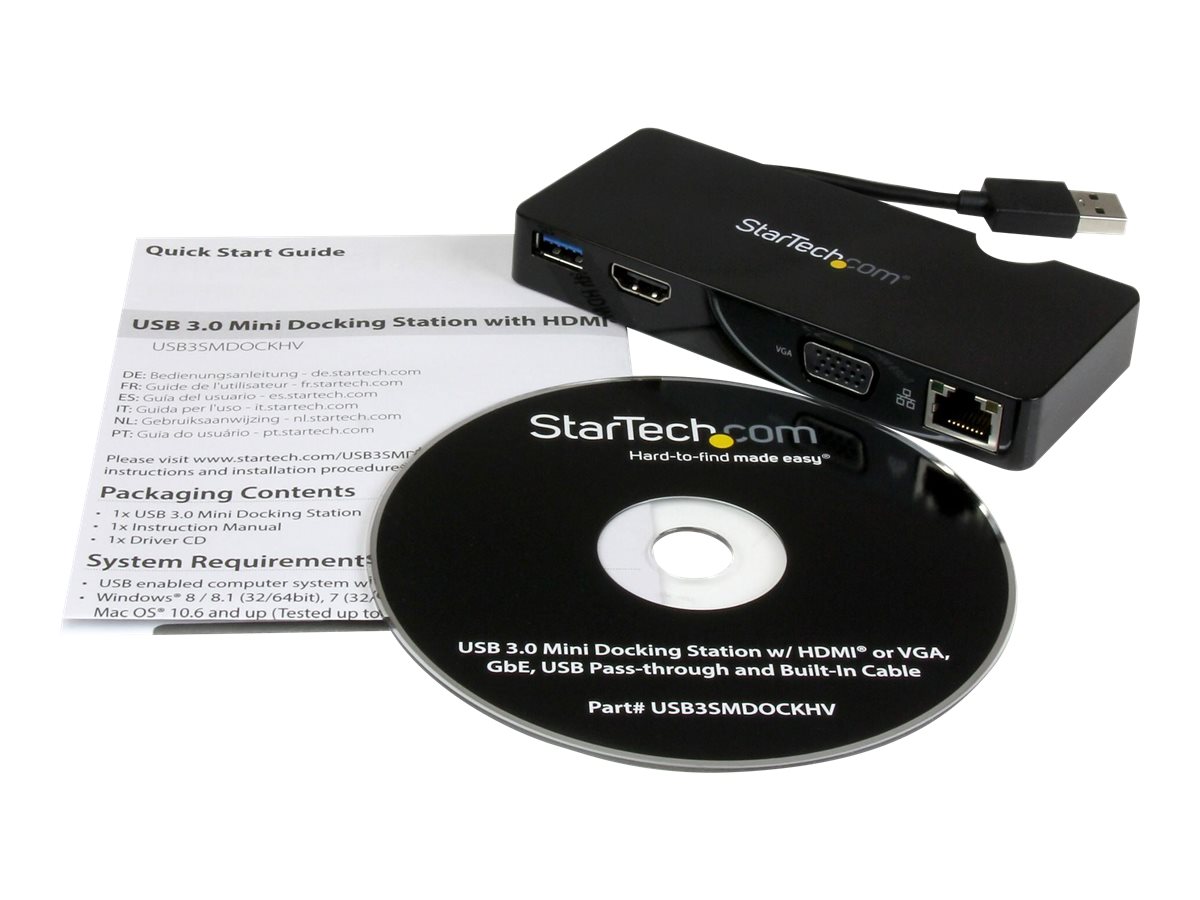 | Popis výrobku | StarTech.com USB 3.0 to HDMI or VGA Adapter Dock - USB 3.0 Mini Docking Station w/ USB, GbE Ports - Portable Universal Laptop Travel Hub (USB3SMDOCKHV) - dokovací stanice - USB - HDMI - 1GbE |