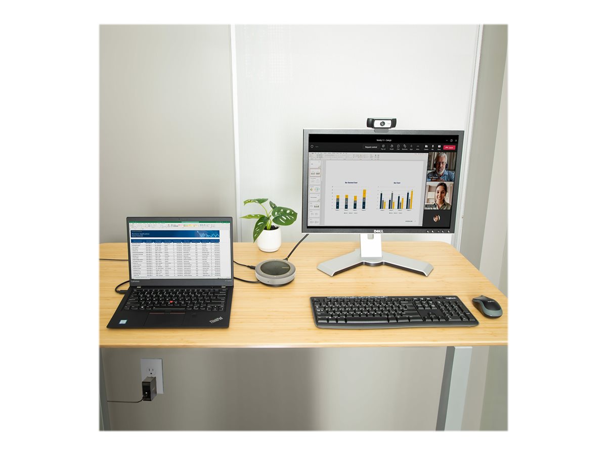 Tento reproduktor je vybaven dvěma mikrofony a snadno použitelnými ovládacími tlačítky a je optimalizován pro různé platformy, včetně Teams a Zoom, což zajišťuje čistý zvuk během hovorů. Integrovaný kabel USB-C 3.2 Gen 1 zjednodušuje nastavení a nabízí přehledný pracovní prostor. Tento mini dok je ideální pro použití v kanceláři nebo na cestách, podporuje nabíjení notebooku a pro větší pohodlí je vybaven tlačítkem pro ztlumení a ovládáním hlasitosti.