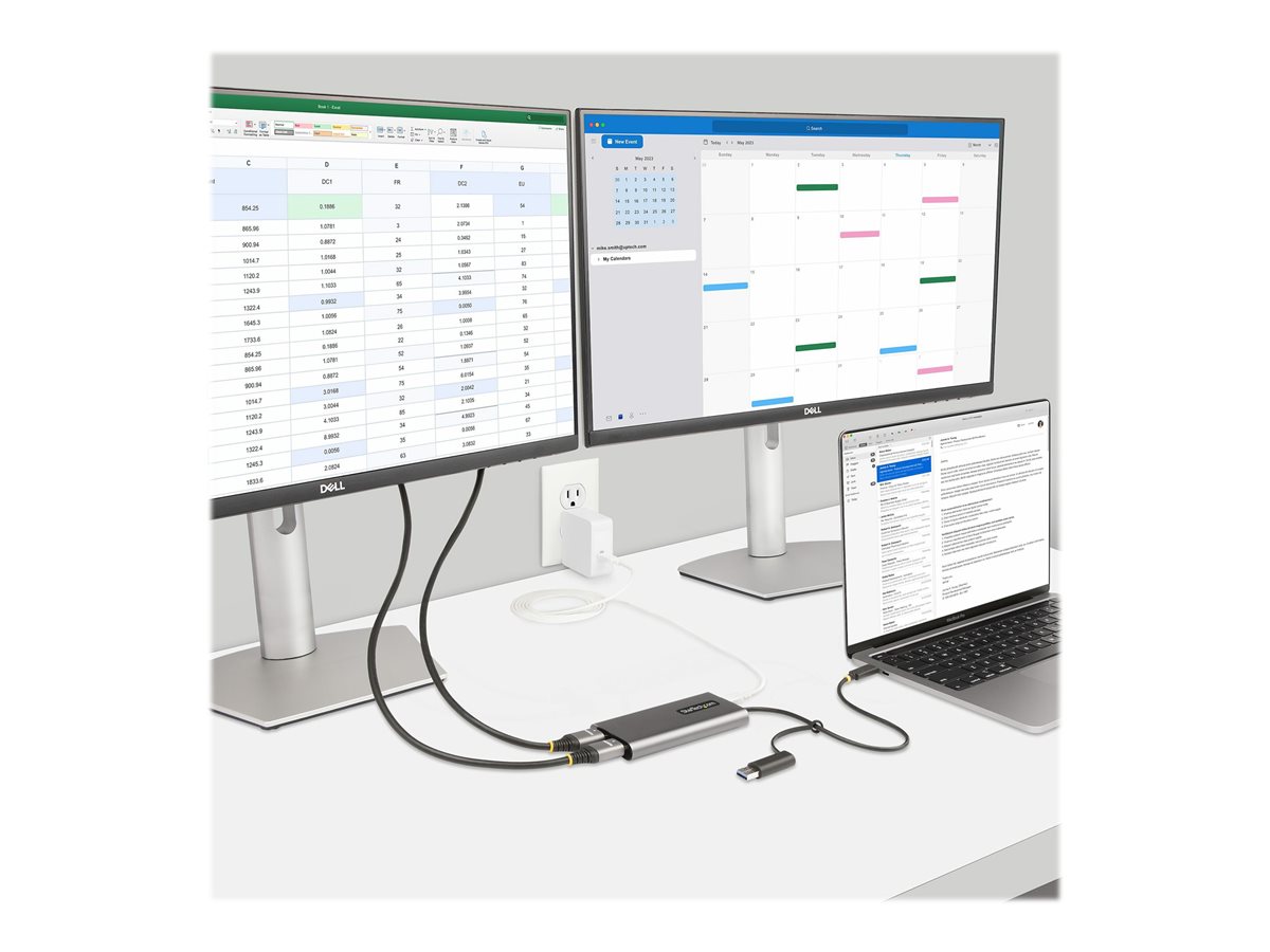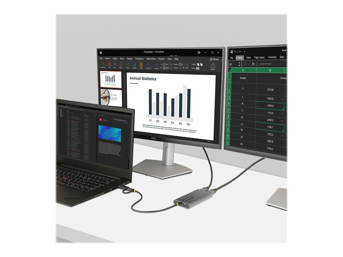 Adaptér StarTech.com USB-C na Dual-HDMI je univerzální externí grafický adaptér navržený tak, aby splňoval potřeby profesionálů i nadšenců. Tento adaptér umožňuje připojení notebooku s rozhraním USB-C nebo A ke dvěma monitorům HDMI a podporuje rozlišení 4K při 60 Hz pro úžasný vizuální zážitek. Díky průchodu napájení 100 W mohou uživatelé nabíjet své notebooky přímo přes adaptér, což zajišťuje nepřerušovanou produktivitu. Odolný hliníkový kryt adaptéru a napájení z sběrnice nabízejí spolehlivost i pohodlí, což z něj činí vynikající volbu pro ty, kteří potřebují výkonné, ale přenosné řešení pro více monitorů. Tento adaptér je certifikován společností DisplayLink a splňuje několik norem, včetně FCC, RoHS a WEEE, což je důkazem jeho kvality a výkonu.
