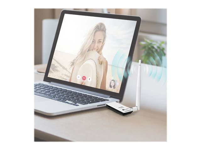 Bezdrátový USB adaptér TL-WN722N Wireless N umožňuje připojení počítače nebo přenosného počítače k bezdrátové síti a k vysokorychlostnímu internetu. Zařízení vyhovuje standardu IEEE 802.11n a poskytuje rychlost bezdrátového přenosu až 150 Mbit/s, která je vhodná pro hraní online her nebo vysílání datového proudu videa. Stisknutím tlačítka QSS (rychlé nastavení zabezpečení) lze snadno zabezpečit bezdrátové připojení pomocí šifrování a zamezit tak útokům zvenčí.